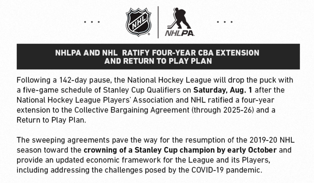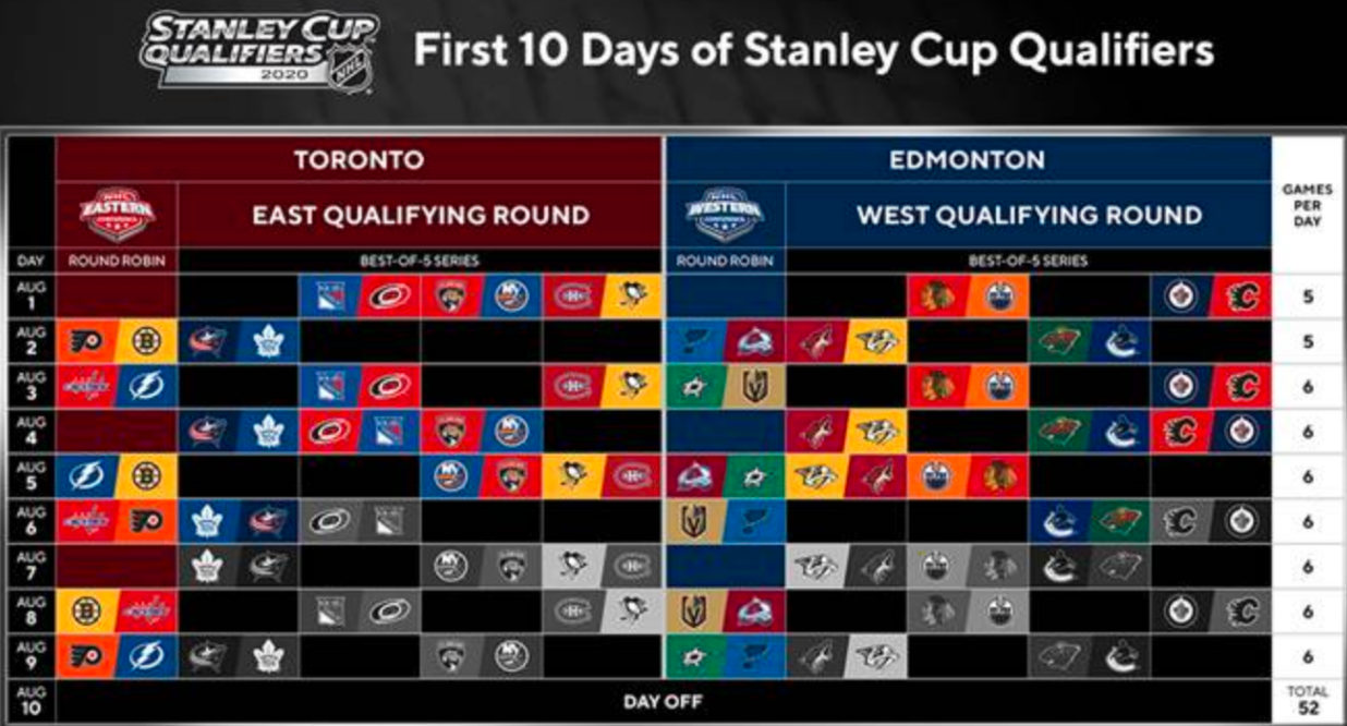 The National Hockey League will go toe-to-toe with the COVID-19 pandemic this summer when it re-launches a paused season with a 24-team championship tournament starting August 1, with the Vegas Golden Knights set to play the Dallas Stars Aug. 3, the St. Louis Blues Aug. 6 and the Colorado Avalanche Aug. 8 to determine the seeding for these unprecedented Stanley Cup playoffs.