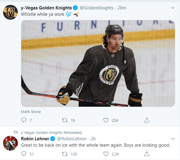 Inside the twin-rink center in Downtown Summerlin, the Vegas Golden Knights were back together for practice. The Golden Knights’ crack Twitter staff showed a picture of star forward Mark Stone, while goalie Robin Lehner tweeted, “The boys were looking good.”