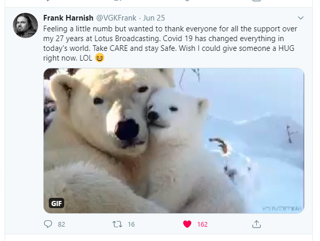 “Covid 19 has changed everything in today’s world,” Harnish wrote in a June 25 tweet about his layoff from Lotus.
