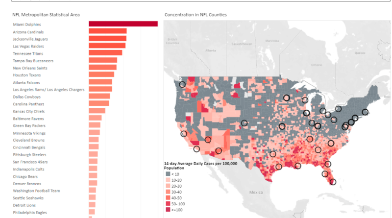 The map is tracking each NFL metro market for the 14-day average daily cases per 100,000 residents. The map also tracks the 14-day average daily cases without a per capita or per 100,000 population analysis. And it monitors the cumulative cases per 100,000 residents in each NFL market.