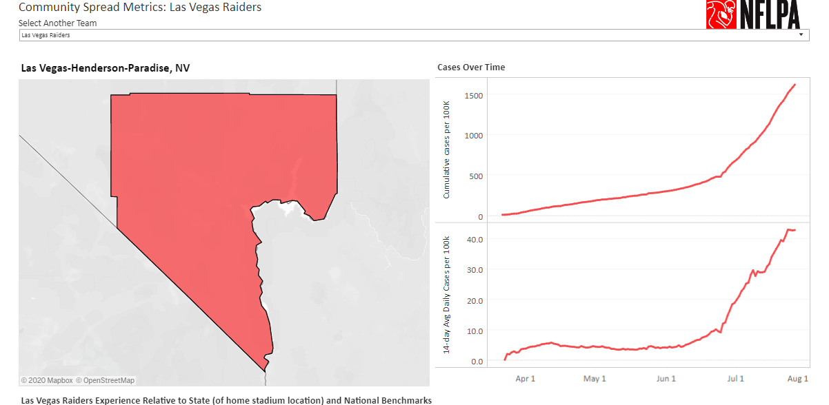 But the Las Vegas Raiders and its Clark County market — based on a metric of 14-day daily average per 100,000 population — rank fourth highest with 42.68 cases per 100,000 in the NFL. You can see the virus case numbers climbed significantly in July.