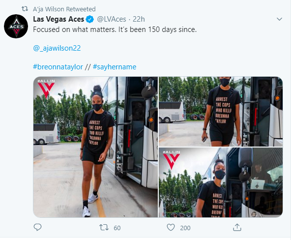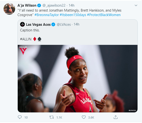 New Las Vegas Aces player Angel McCoughtry with Breonna Taylor’s name on her jersey.
