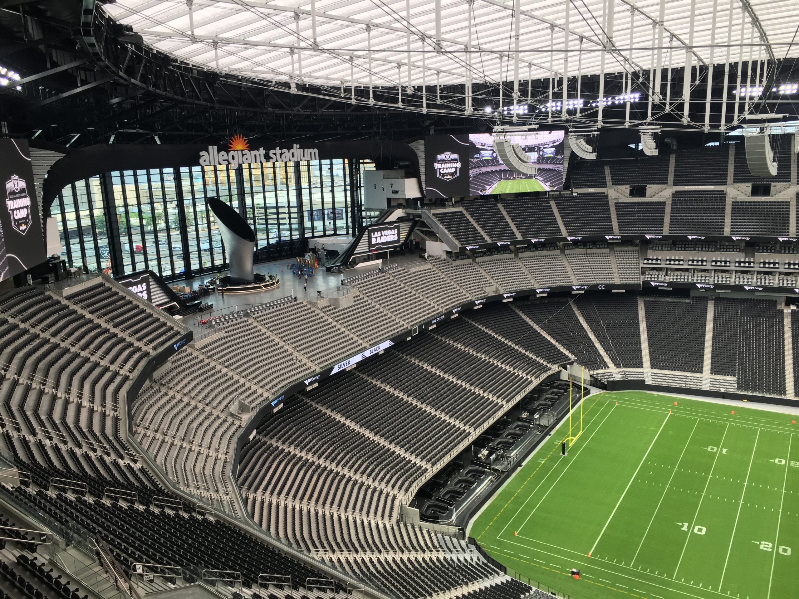And on Friday four years later, Las Vegas Raiders players dressed in their silver and black uniforms threw passes, caught footballs and dug their cleats into an emerald green natural playing surface under a stadium dome for the first time. The Raiders practiced in new Allegiant Stadium after conducting drills and practices at their training center/headquarters in Henderson about 10 miles to the south and east of the massive new stadium off the Strip.