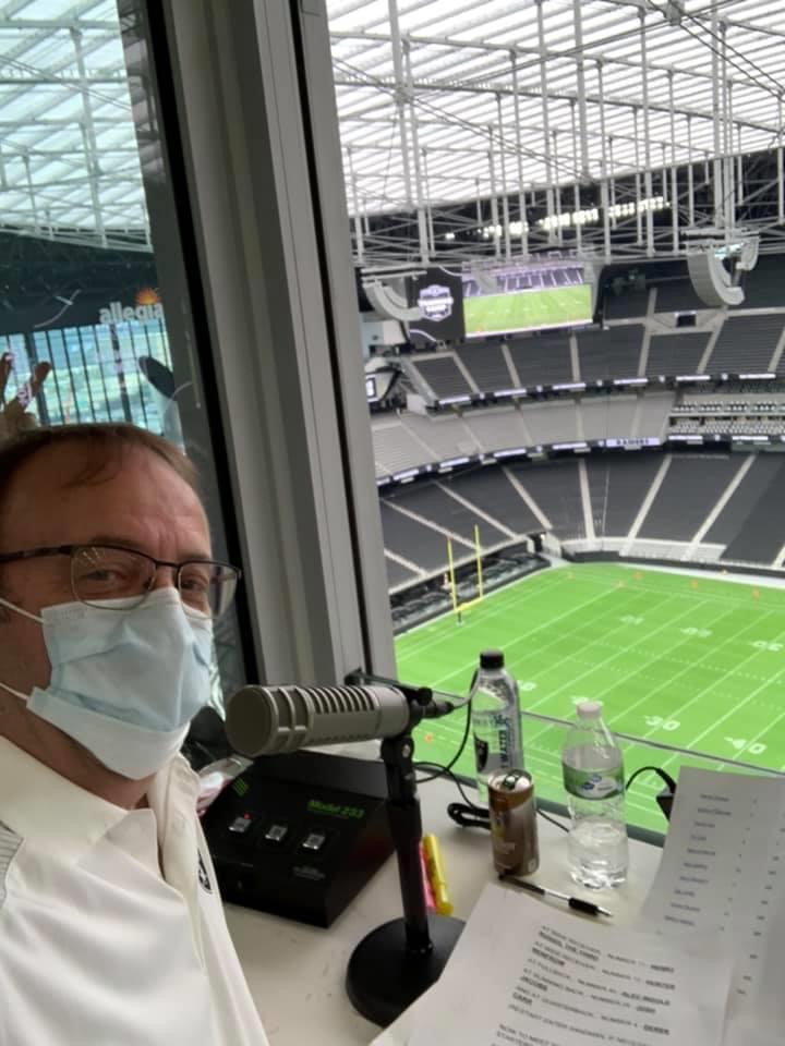 The stadium announcer is a familiar voice. The affable Bruce Cusick, the popular arena voice of Vegas Golden Knights games at T-Mobile Arena, was the PA stadium announcer. Cusick posted this photo on his Facebook page.