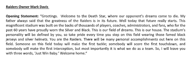 Raiders owner Mark Davis went on the public address system and told the players, “This is our field of dreams. This is our house.” Davis called the building the “Death Star.”