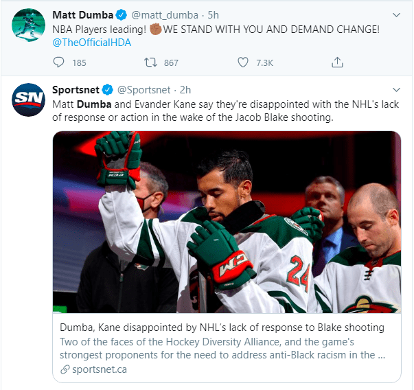 The National Hockey League staging three playoff games Wednesday while the NBA players decided not to play their playoff games in the Orlando NBA Bubble. That drew criticism from Black NHL players like Evander Kane of San Jose and Matt Dumba of Minnesota, who criticized the NHL for its lack of a response to the shooting of Blake, a Black man in Kenosha, Wisconsin. Police shot Blake multiple times, leaving the 29-year-old man paralyzed.