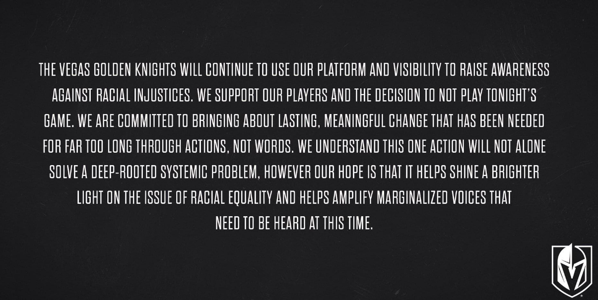 The Vegas Golden Knights vs. Vancouver Canucks playoff game scheduled for Thursday has been postponed in the aftermath of the Jacob Blake police shooting in Wisconsin Sunday.