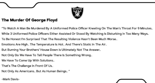 NHL and NBA players have also protested against what they say is racial injustice in the way police treat Black people in this country. More than two months ago, Raiders owner Mark Davis wrote this regarding what he called “The Murder of George Floyd.”
