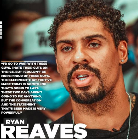 The Golden Knights’ Ryan Reaves, the only Black VGK player in the playoff games in the NHL Western Conference Bubble in Edmonton, was lead speaker at Thursday’s unprecedented gathering of Western playoff team players for a media session to discuss why they would not play postseason games Thursday and Friday to shine a light on racial injustice cases in the U.S. It was a historic sign of unity and the players did not criticize police, choosing to focus on eliminating racial injustices.