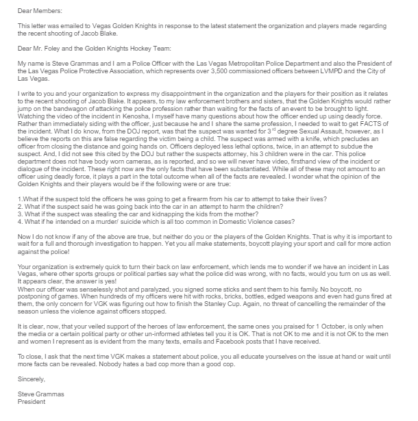 This letter is in direct response to the open letter issued to the Vegas Golden Knights (VGK) from the Las Vegas Police Protective Association president and Las Vegas Metropolitan police officer Steve Grammas after the VGK postponed their game with the Canucks to be in solidarity with the movement to end racism and police violence.