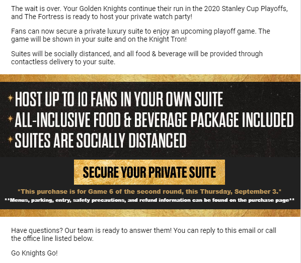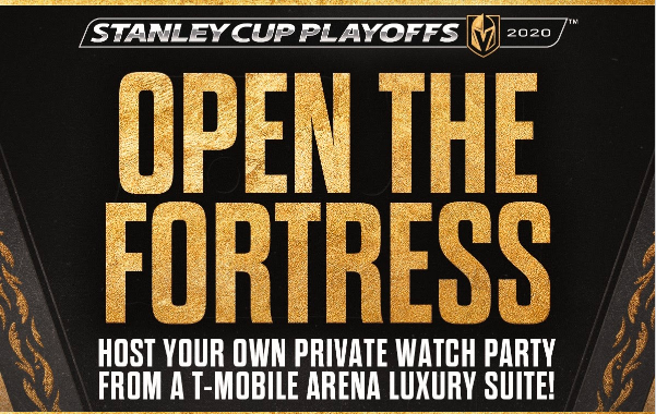 Here’s the suite playoff game pitch sent to Golden Knights fans. It’s good for a VGK vs Vancouver playoff game on Thursday for up to 10 fans per suite with food and beverage included in the deal. And social distancing is part of the arrangement, too.