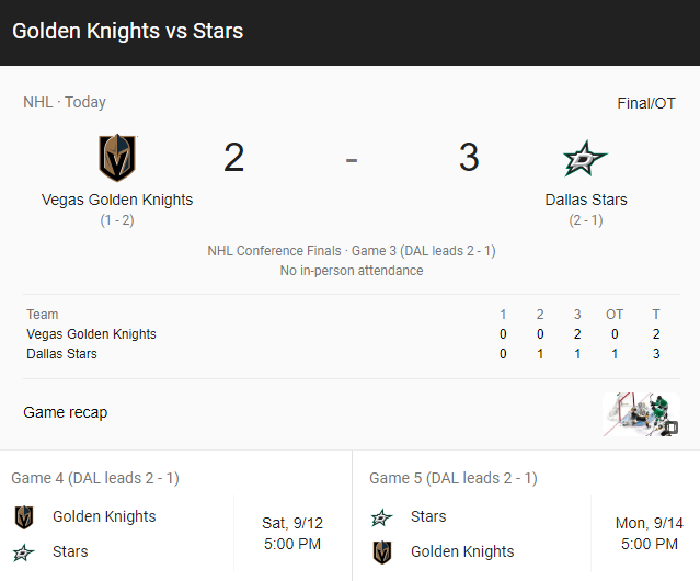 Dallas Defeats Golden Knights In OT In Game 3 To Take Lead In West Finals