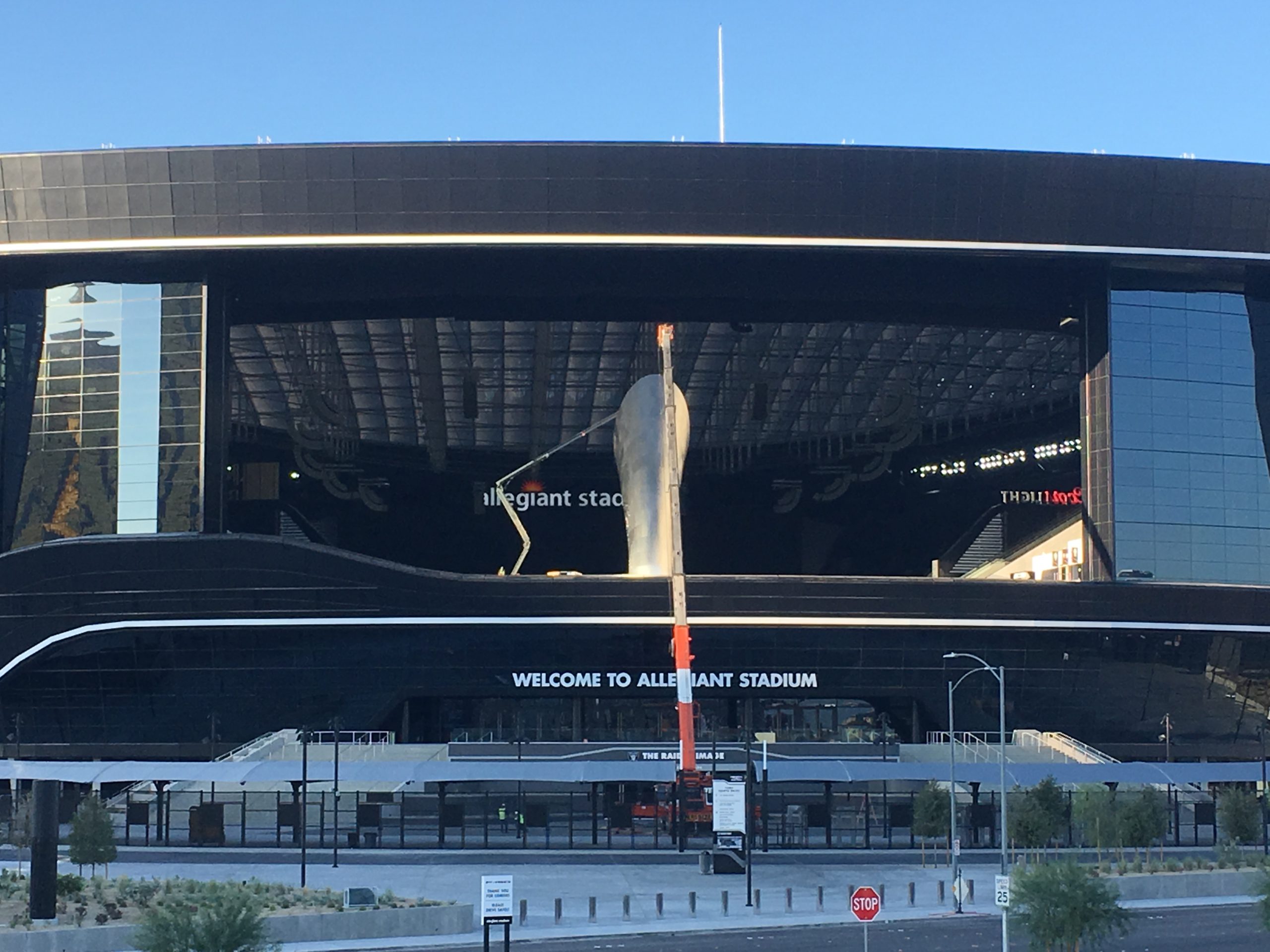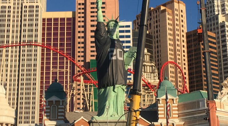Thursday morning, Lady Liberty at NY NY at the corner of the Strip and Tropicana Avenue had an NFL Raiders jersey on.