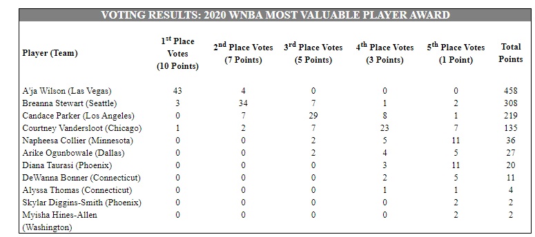 Wilson was picked first on 43 of 47 ballots of a national panel of sportswriters and broadcasters, who selected their top five for the MVP award. The 2018 WNBA Most Valuable Player, Seattle Storm forward Breanna Stewart, finished in second place with 308 points, three of which were first-place votes.