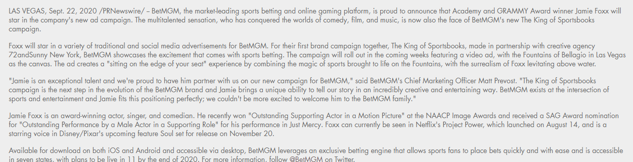“The King of Sportsbooks campaign is the next step in the evolution of the BetMGM brand and Jamie brings a unique ability to tell our story in an incredibly creative and entertaining way,” he said. BetMGM exists at the intersection of sports and entertainment and Jamie fits this positioning perfectly; we couldn’t be more excited to welcome him to the BetMGM family.”