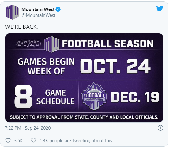 The Mountain West decided Aug. 10 to postpone its football because of the pandemic, but has voted to play a college football season this fall. The league has announced it will play a season which will feature eight games and begin on Oct. 24.