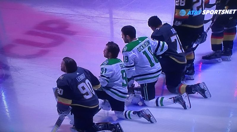 VGK and Dallas players kneel during anthem before first game of round-robin series more than two weeks ago at the NHL postseason bubble in Edmonton.