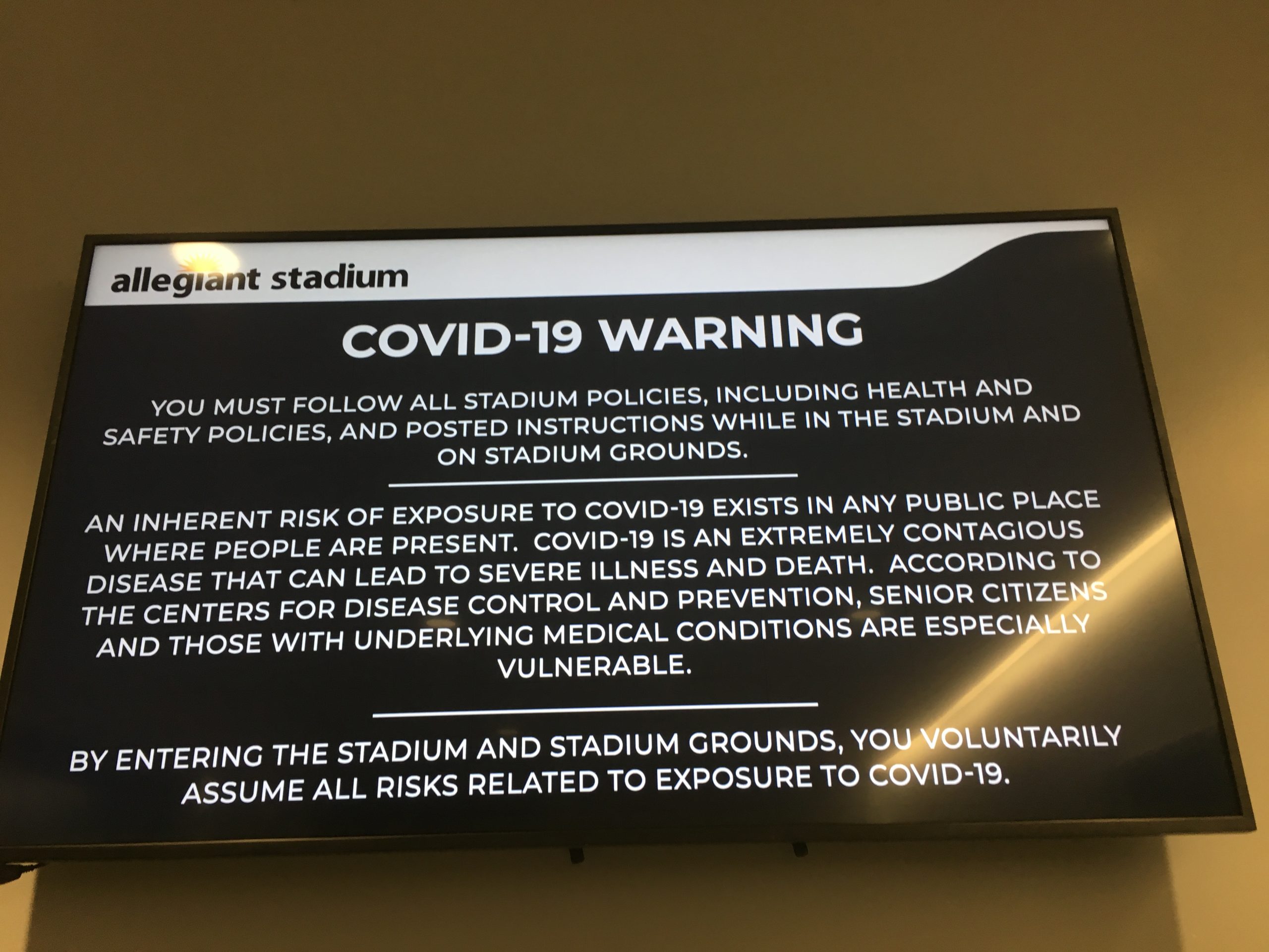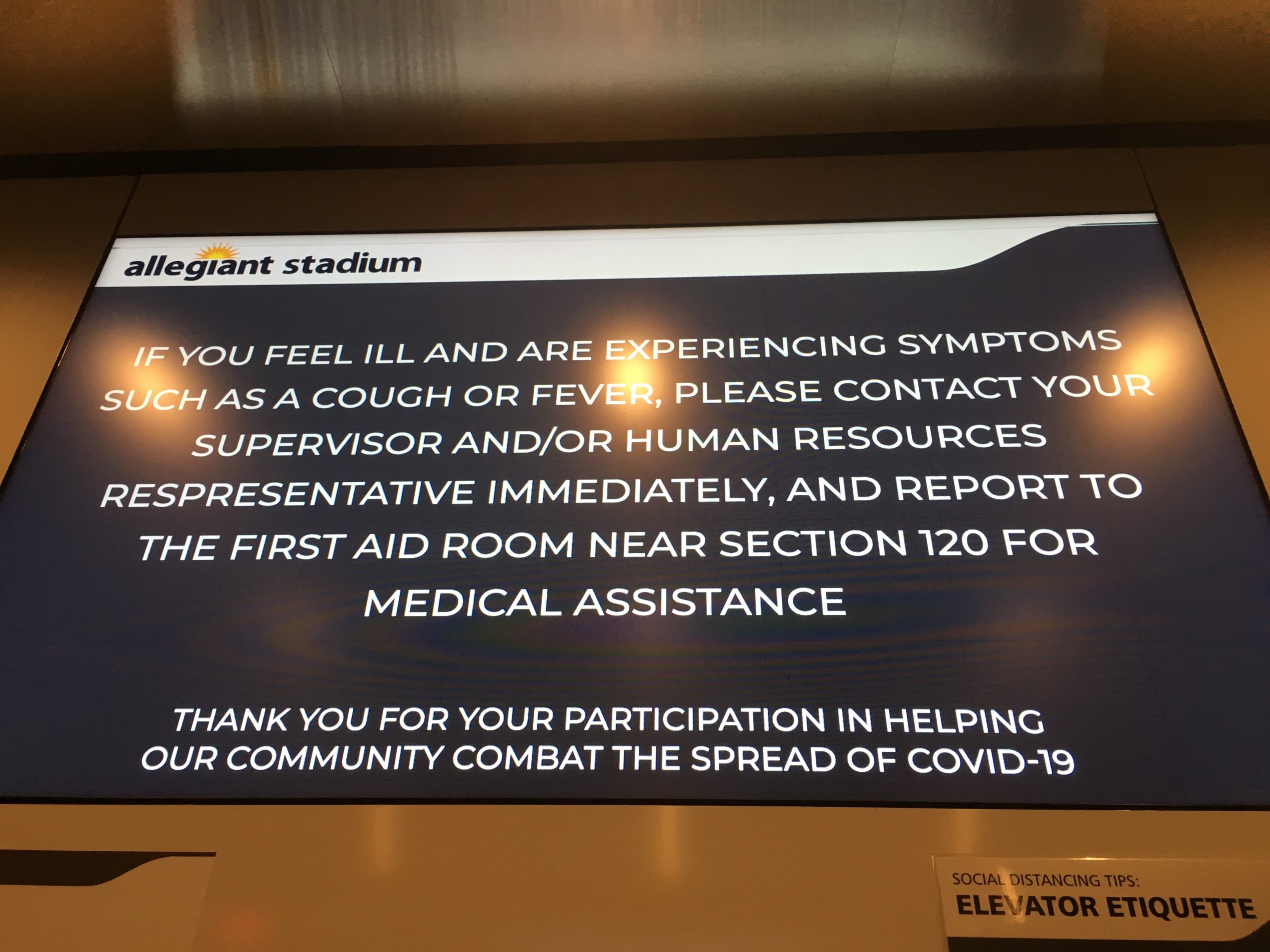 At Allegiant Stadium, the COVID-19 protocol signs are everywhere. They’re in elevators.