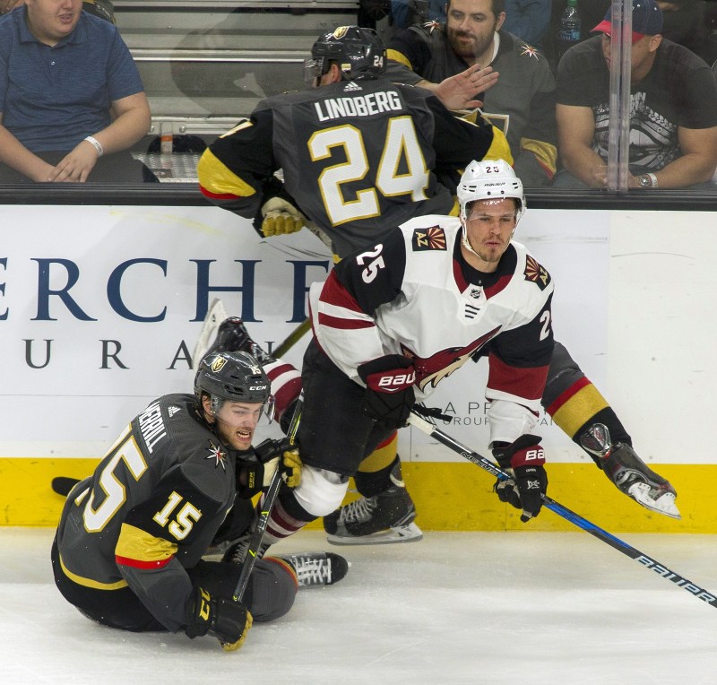 Vegas Golden Knights defenseman Jon Merrill (15) takes down Arizona Coyotes center Nick Cousins (25) with center Oscar Lindberg (24) trapped on the boards during the second period of an NHL game at T-Mobile Arena on Wednesday, March 28, 2018, in Las Vegas. L.E. Baskow