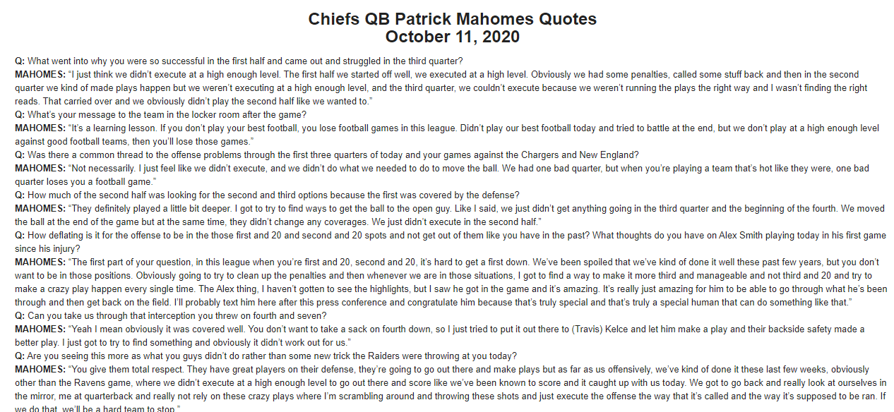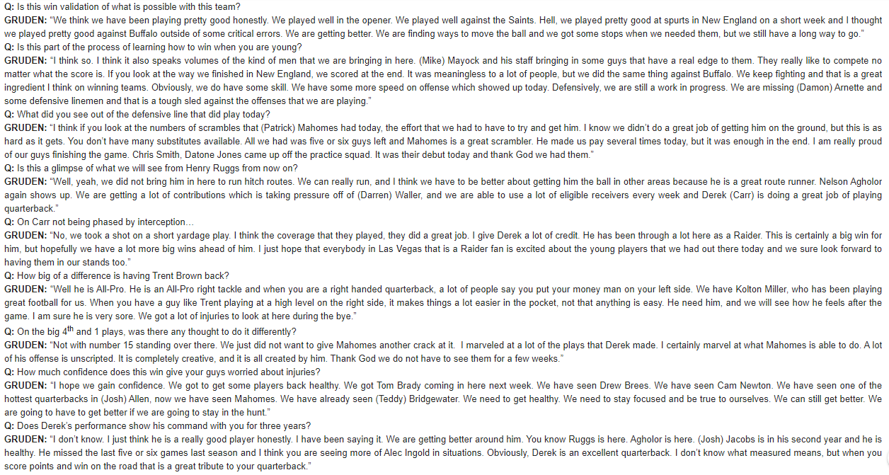 We tried to be aggressive. We threw down the field today, and some of the pro-football focused statisticians will have to scratch their heads because they are going to have to figure out if he really did that. Ruggs is healthy and he is just going to go down the field. We tried to get Waller a couple of times, but you can’t always throw it down the field. They have Chris Jones and Frank Clark and honey badger (Tyrann Mathieu). I am just happy that Derek got a big win as a starting quarterback and so did our young football team when it did not look real good early. — Jon Gruden