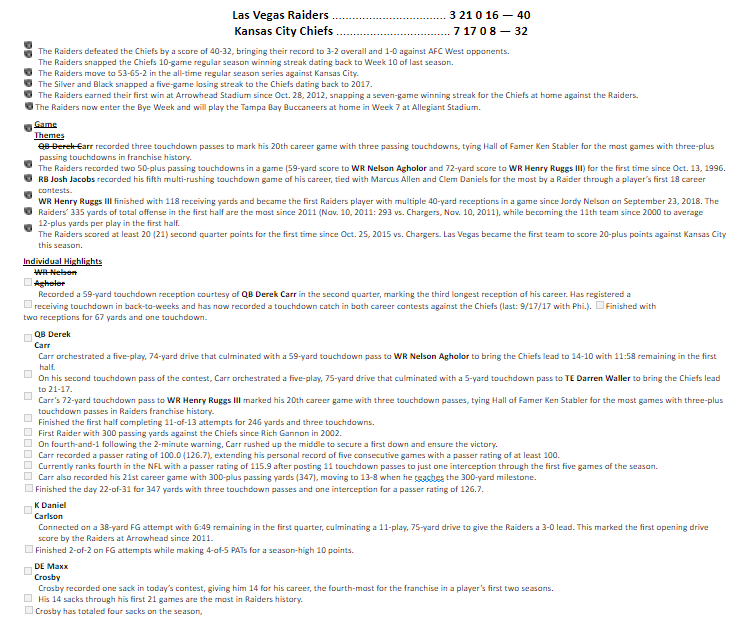 The Raiders are 3-2, while the Chiefs drop to 4-1. It was the Raiders’ first win over the Chiefs since 2017.