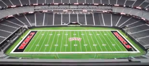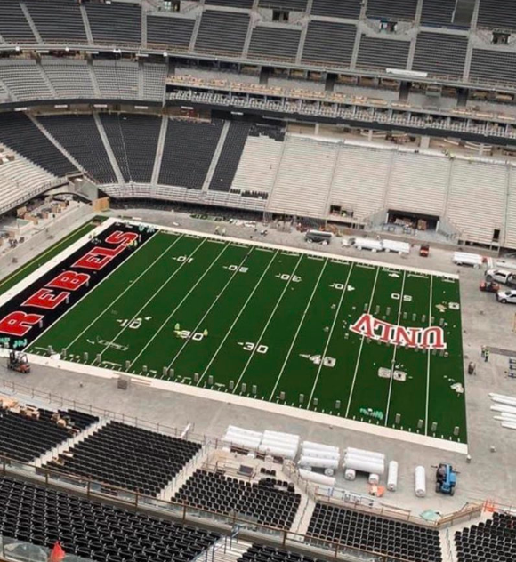 The stadium will roll in a special artificial playing surface into the venue, which is a different playing surface used by the Raiders, which have a retractable tray with natural grass, not artificial turf. UNLV’s season-opener is at San Diego State Saturday.