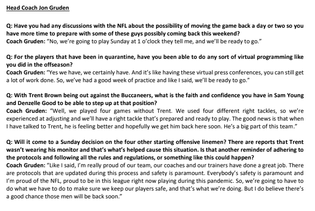 Gruden said earlier this week, “We had to send five our starting linemen home today because they had a tracer. I guess they were around Trent.”