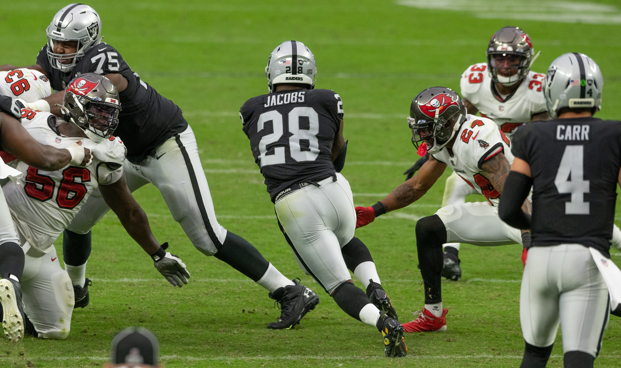 But the big weekend show was the Tampa Bay Buccaneers at the Las Vegas Raiders. Originally scheduled for Sunday Night Football , which would have been a prime showcase for Allegiant Stadium and the Las Vegas Strip, the game was moved to Sunday afternoon after several Raiders team members were placed in the high-risk COVID-19 protocol.