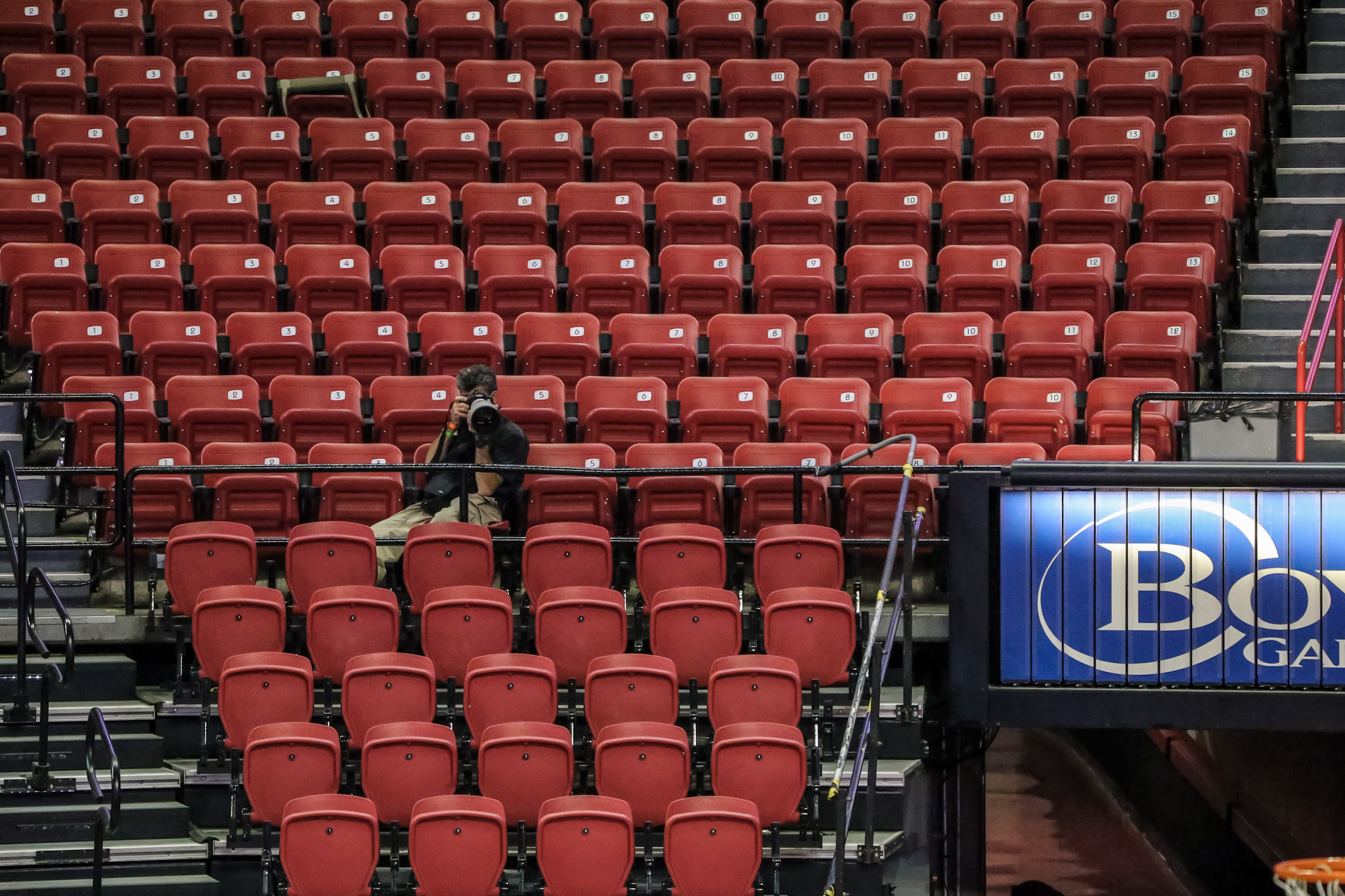 There were no fans in the arena because of the novel coronavirus pandemic and Las Vegas’ high infection rates. The Mack’s main concourse was dark and silent. Media were allowed, but plexiglass partitions separated the sports writers in section 105. Photographers were not allowed on the court floor, but did roam the empty stands for their pictures and video.