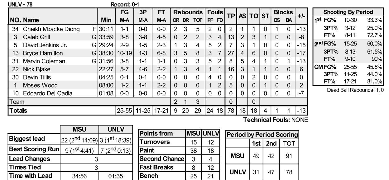 Montana State, coming off a 16-15 record last season, led 49-31 at halftime and UNLV never made the game a competitive match in the second half. Final score: Montana State 91 UNLV 78.
