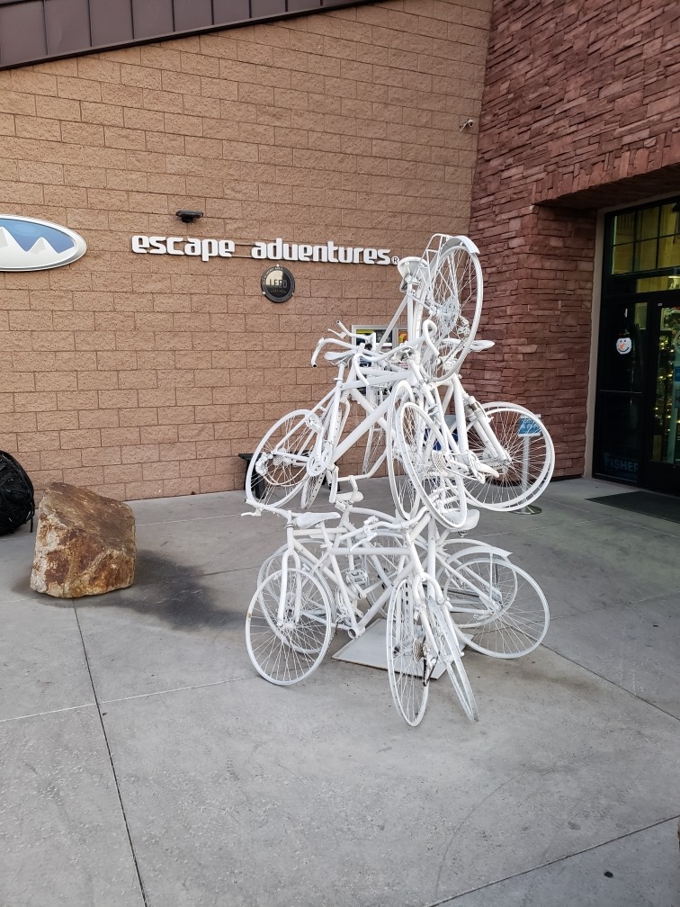 In front of Las Vegas Cyclery is a memorial ghost bike artwork honoring the memory of bicyclists killed by motorists in Clark County.