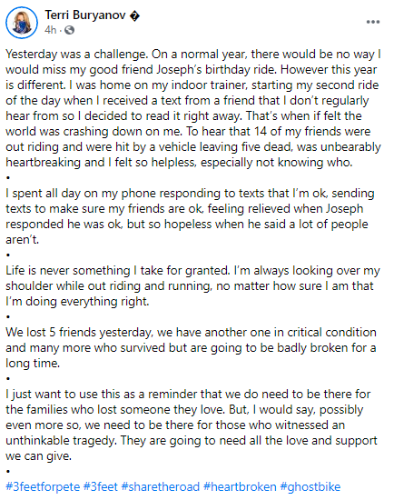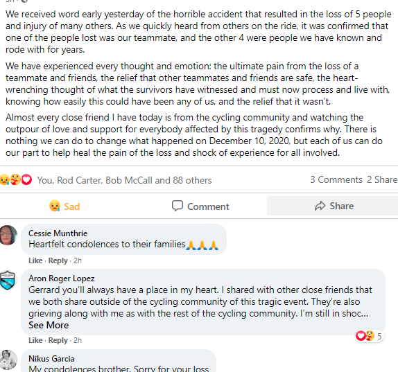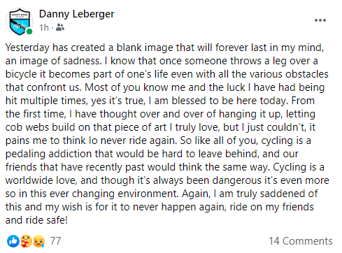 On Friday morning, bicyclists began sharing memories, thoughts and comments about this tragedy on Facebook. Here are a few examples of the posts.