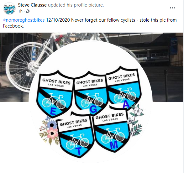 Ghost Bikes Las Vegas is an organization that installs white ghost bike memorials at sites where bicyclists were killed by motorists, and their logo, sadly, is now appearing on many bicyclists’ profiles on social media. Here is one graphic that was created Thursday night.