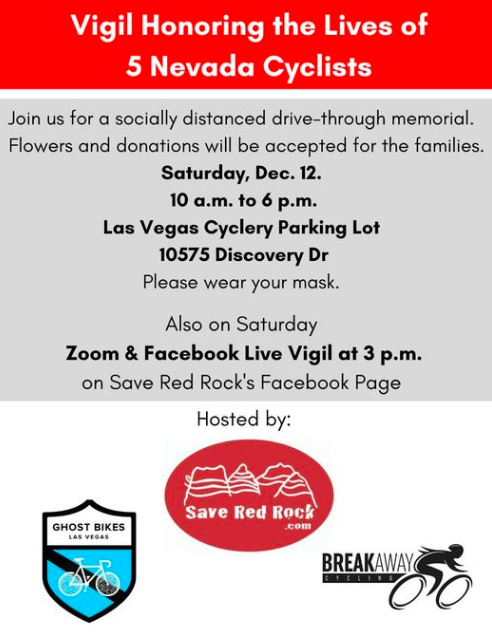 There will be a drive-through vigil for the five bicyclists at the Ghost Bike Memorial at Las Vegas Cyclery Saturday from 10 am-6 pm and a virtual memorial at 3 p.m., according to a Facebook event page.