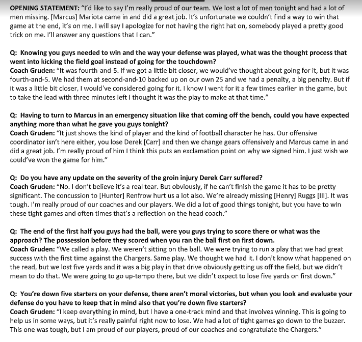 I keep everything in mind, but I have a one-track mind and that involves winning. This is going to help us in some ways, but it’s really painful right now to lose. We had a lot of tight games go down to the buzzer. This one was tough, but I am proud of our players, proud of our coaches and congratulate the Chargers. — Jon Gruden