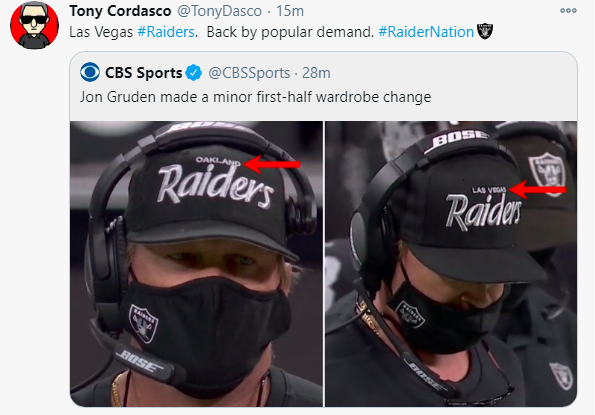 The only other scrap of amusing drama in the first half was Raiders coach Jon Gruden wearing a Raiders ballcap that said, “Oakland,” instead of “Las Vegas.” Not good for Las Vegas during those prime time TV close-ups of Gruden. But Gruden switched caps to show the Las Vegas moniker.  “I apologize for not having the right hat on, somebody played a pretty good trick on me.”
