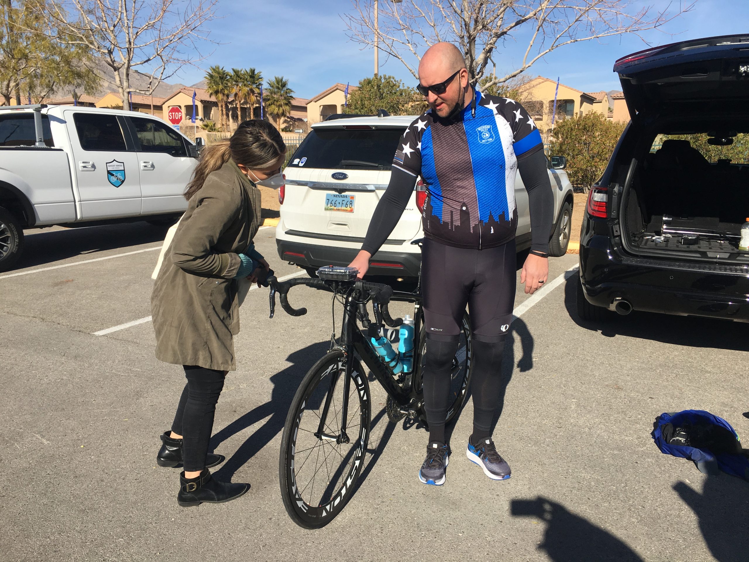 LVSportsBiz.com interviewed Campbell before he took off on his road bicycle equipped with gear to detect cars that get too close to him and his bike.