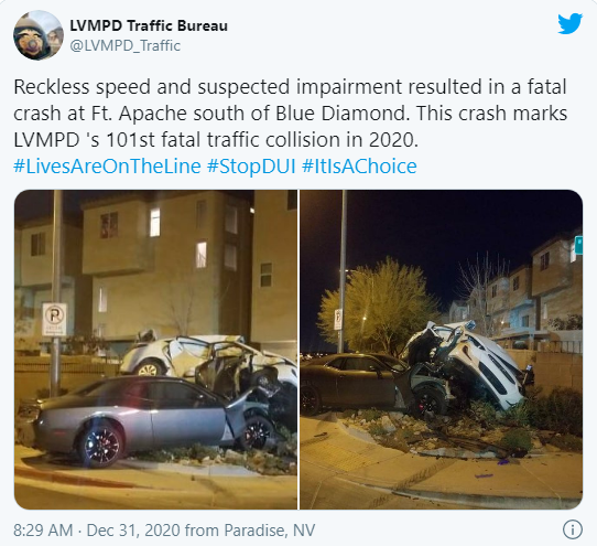 The accused driver is 19-year-old Zaon Collins, a UNLV basketball recruit who was a star player at Bishop Gorman High School. Police say Collins was driving a Dodge Challenger 88 mph in a 35 mph zone and showed signs “consistent with being under the influence of marijuana,” according to media reports.