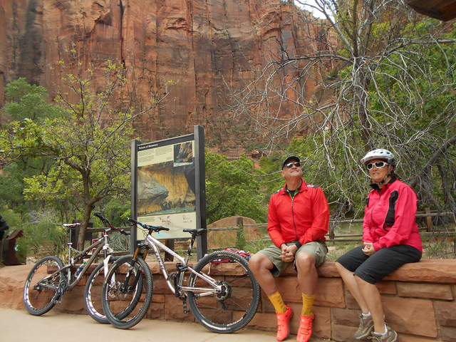 I highly recommend that you lock your bicycle near the guard station right after the end of the tunnel for a 1½-mile round-trip hike on the Canyon Overlook Trail. You will enjoy majestic vistas of the switchbacks and the land formations extending into the sky some 7,000 to 8,000 feet.