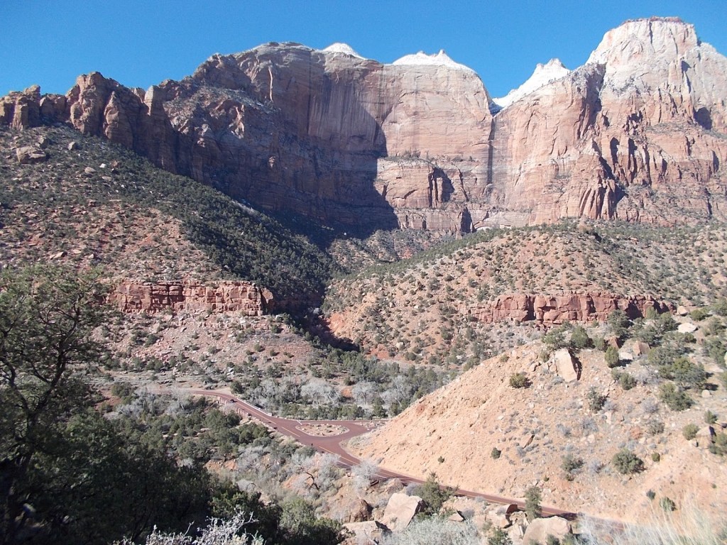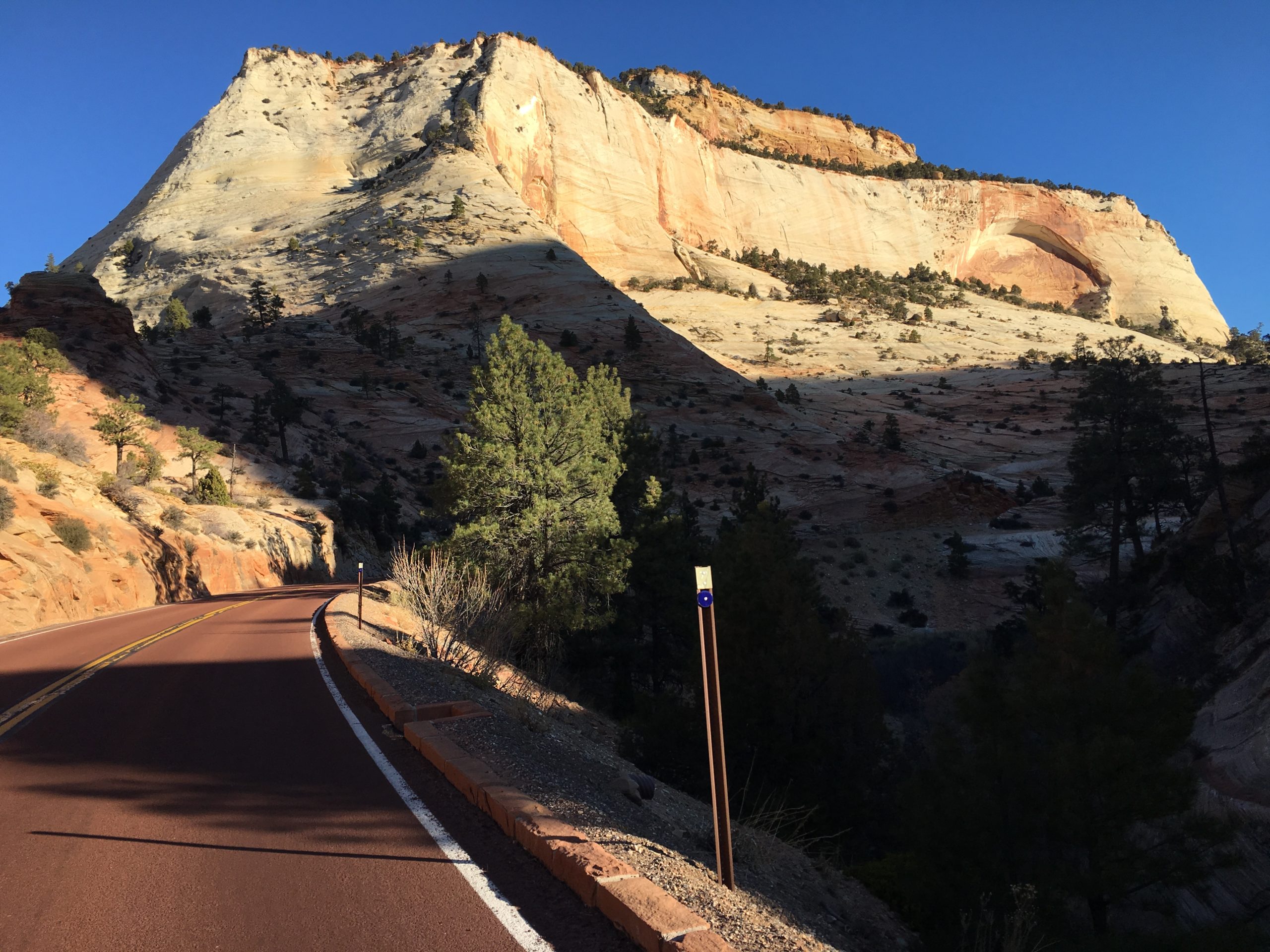 It’s the Zion-Mount Carmel Highway, which starts off as a series of switchbacks for a few miles before it reaches a 1-mile tunnel that is off-limits to bicycles. If you’re on a bike, sometimes you can hitch a ride with a friendly motorist, or just drive with your bike and park at a turnout past the tunnel because this road is spectacular to pedal for the first 5 miles past the tunnel.