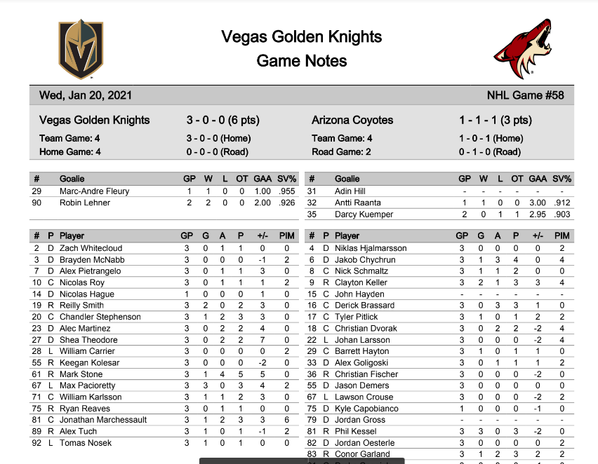 The Knights are off to Arizona for a two-game series on Friday and Sunday then return to Las Vegas for games against St. Louis Tuesday and Thursday.