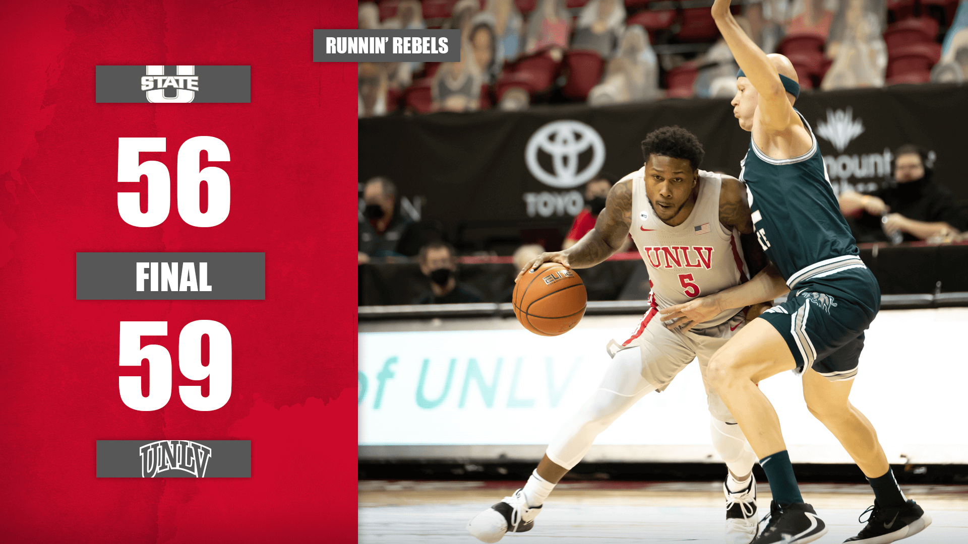 This time, it was a 59-56 win over Utah State at Thomas & Mack Center Monday night. UNLV evened its record at 6-6.