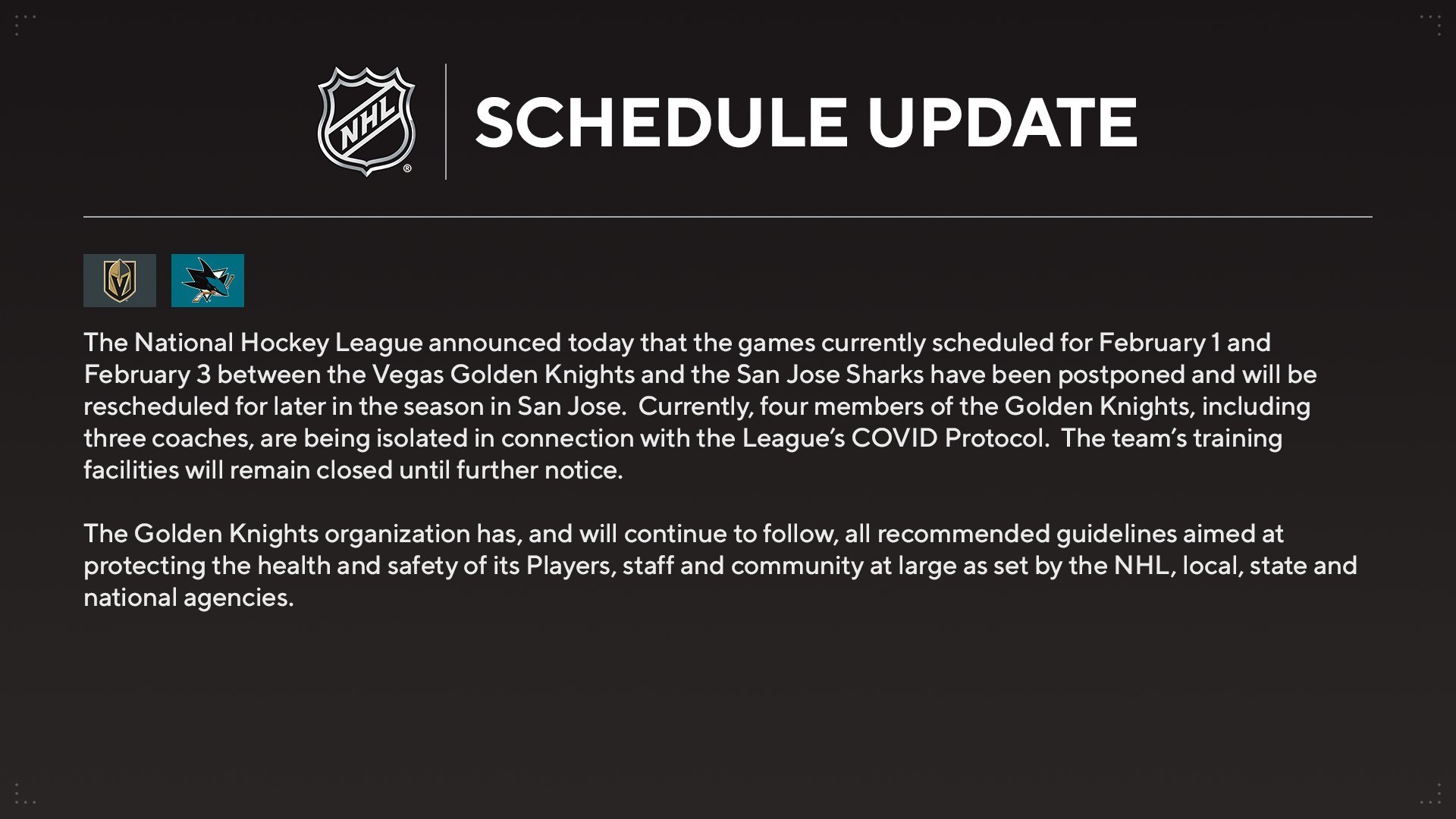 Golden Knights-San Jose Sharks’ Two-Game Series Postponed Feb. 1 and 3