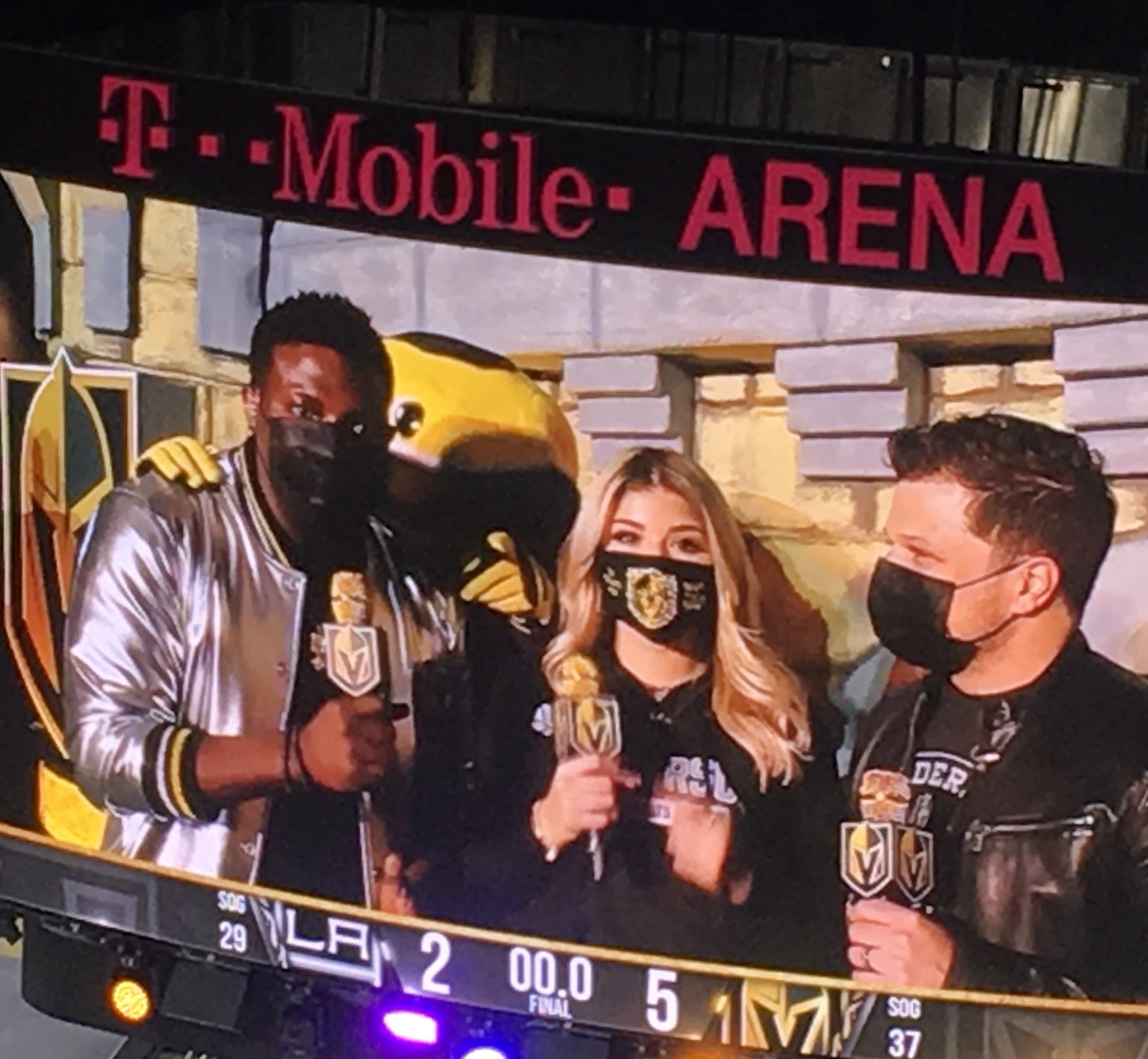 Las Vegas radio personality/entertainer Bojo Ackah, who did Las Vegas Lights soccer game emcee duties, will be the Henderson Silver Knights game host at Orleans Arena when Silver Knights play their inaugural regular season game tomorrow night at 7PM. Bojo was hanging out with VGK game hosts Mark Shunock and Katie Marie Jones at tonight VGK-LA game here at T-Mobile Arena.