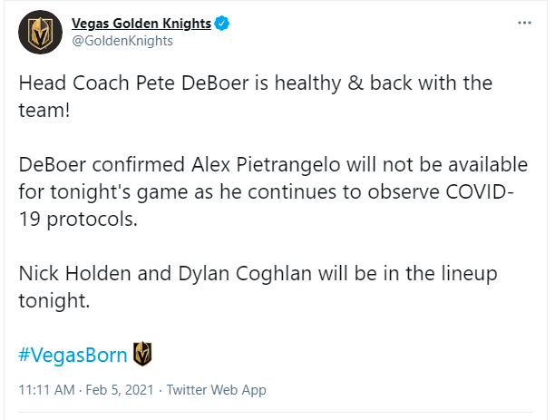 VGK Coach DeBoer Returns For Tonight’s Golden Knights-Kings Game, But Pietrangelo Remains On NHL Covid Protocol List