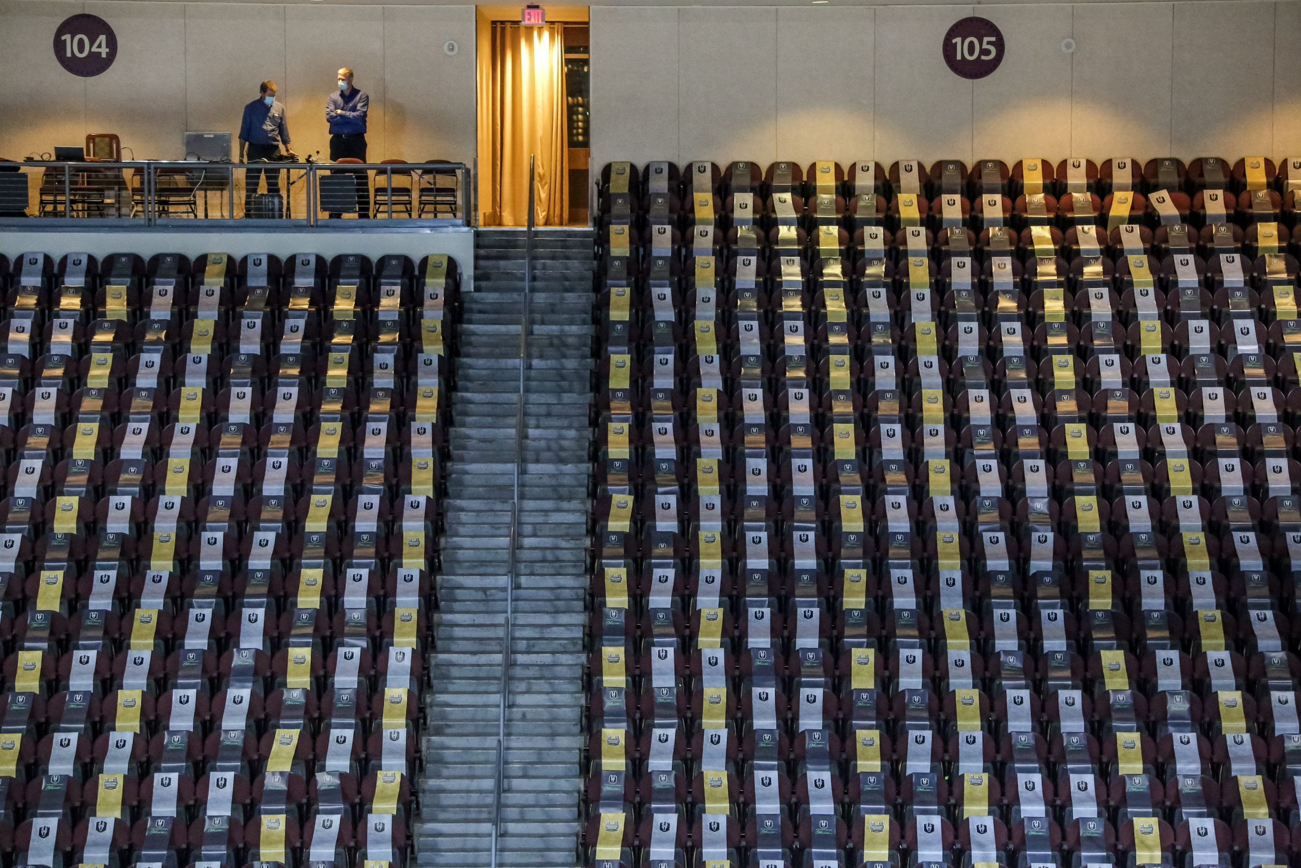 Silver and gold seat coverings adorned the seats at Orleans Arena for the inaugural regular season game. The Silver Knights train at Lifeguard Arena, a two-rink community ice center in downtown Henderson about seven miles from the $84 million Henderson Event Center. Lifeguard Arena resembles the VGK headquarters and training center at City National Arena in Downtown Summerlin.