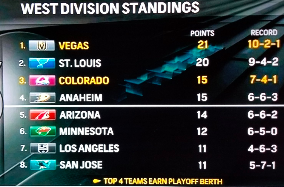 The Knights are now 10-2-1 for 21 points with a 13-goal differential, while the Avs are 7-4-1 for 15 points and a 13-goal differential.