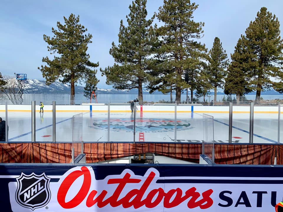 The Golden Knights play the Colorado Avalanche as an away game at an outdoor rink fabricated on the 18th hole fairway at Edgewood Tahoe Resort in Stateline. Nevada Saturday. Take a look at the fairway converted into a temporary NHL rink.
