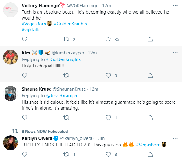 The Golden Knights took a 2-0 lead behind red-hot Alex Tuch, who scored his seventh goal in seven games. It was his 11th of the season.