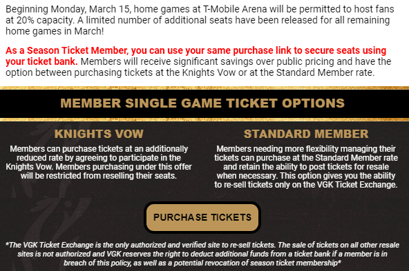 Golden Knights season ticket holders were notified by the team Thursday morning about the increased arena fan capacity. “A limited number of additional seats have been released for all remaining home games in March,!” the VGK message to season ticket holders said. Here’s the message to season ticket holders.